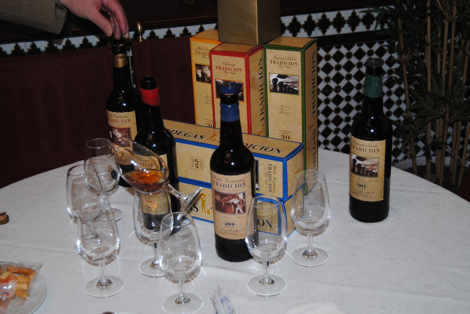 mítico por su cocina tradicional y esmerado servicio clásico que siempre es un placer visitar. Aquí Pepe Blandino, el capataz de Bodegas Tradición nos deleitó con su simpatía y su profundo conocimiento de los Vinos de Jerez, haciéndonos una cata guiada de sus caldos: el Palo Cortado Tradición VORS, el Amontillado Tradición VORS, el Oloroso Tradición VORS, y para el postre dejamos el Pedro Ximénez Tradición VOS. Los Amontillados y Palo Cortado los maridamos con tortillitas de camarones, ortiguillas, boquerones, matrimonio, erizo de mar, y como plato principal rabo de toro que con el